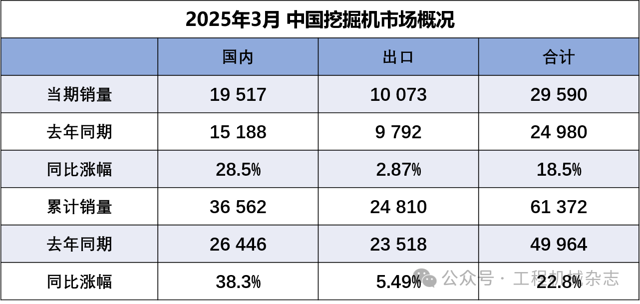 据中国工程机械工业协会对挖掘机主要制造企业统计,2025年3月销售各类挖掘机29590台,同比增长18.5%。其中国内销量19517台,同比增长28.5%;出口量10073台,同比增长2.87%。2025年1—3月,共销售挖掘机61372台,同比增…......
