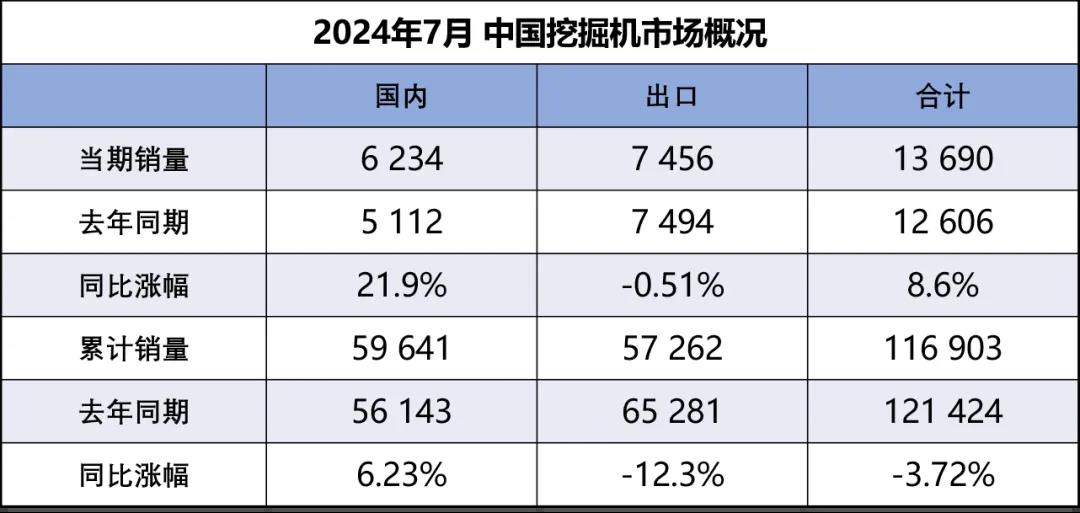 据中国工程机械工业协会对挖掘机主要制造企业统计,2024年7月销售各类挖掘机13690台,同比增长8.6%,其中国内6234台,同比增长21.9%;出口7456台,同比下降0.51%。2024年1—7月,共销售挖掘机116903台,同比下降3.72%…......