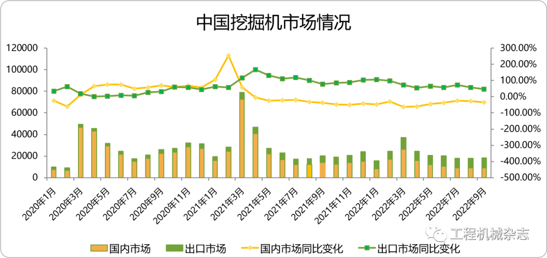 据中国工程机械工业协会对26家挖掘机制造企业统计,2022年10月销售各类挖掘机20501台,同比增长8.1%,其中国内11350台,同比下降9.91%;出口9151台,同比增长43.8%。2022年1-10月,共销售挖掘机220797台,同比下降26%…......