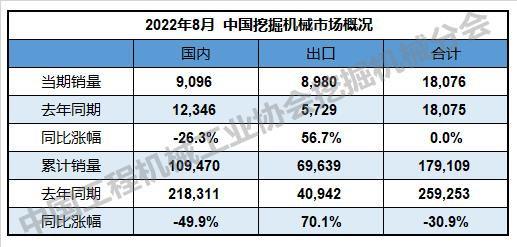 根据中国工程机械工业协会行业统计数据,2022年1—8月纳入统计的26家主机制造企业,共计销售各类挖掘机械产品179,109台,同比下降30.9%。其中,国内市场销量109,470台,同比下降49.9%;出口销量69,639台,同比增长70.…......