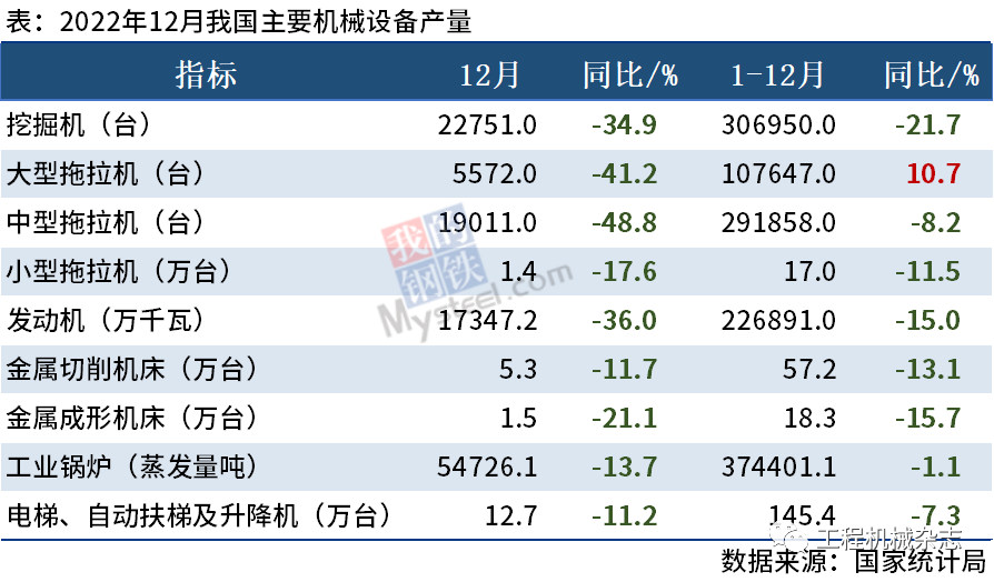 国家统计局最新数据显示,2022年12月挖掘机产量22751台,同比下降34.9%。2022年全年累计产量306950台,同比下降21.7%。拖拉机方面,12月大中小型拖拉机产量分别为5572台、19011台、1.4万台,同比分别下降41.2%、48.8%…......