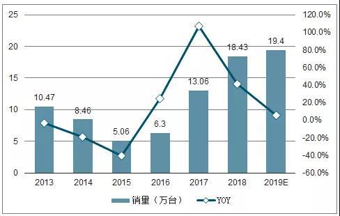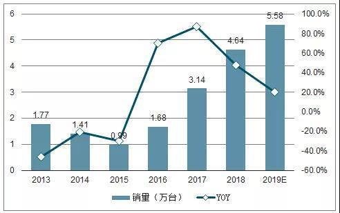 2013-2019年国内挖机销量及增速预测