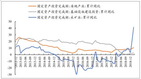 从2017年固定资产投资额结构看,基建、地产、矿山占比分别为27.4%、22.1%和1.5%。2019年1-2月,固定资产投资完成额同比增长6.1%,较18年提升0.2pct,其中基建、地产和矿山开采投资额同比分别增长2.5%、10.6%和41.4%,较18年分别提升0.7pct、2.3pct和37.3pct。