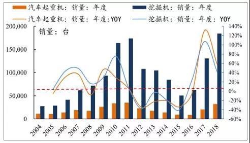 挖机和起重机的应用场景重合度非常高。2018年挖机和汽车起重机销量分别为18.4万台和3.2万台,挖机销量超过历史高点。