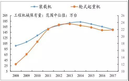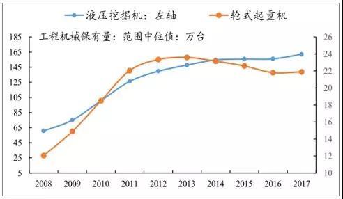 根据工程机械协会公布的工程机械保有量,截至2017年底,挖机和轮式起重机的保有量分别为155.7~168.6万台和21~22.8台,根据历年保有量范围的中位数,近年来挖机保有量保持缓慢增长,而起重机保有量甚至在2013年高点之后出现下滑。