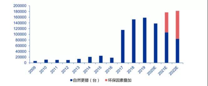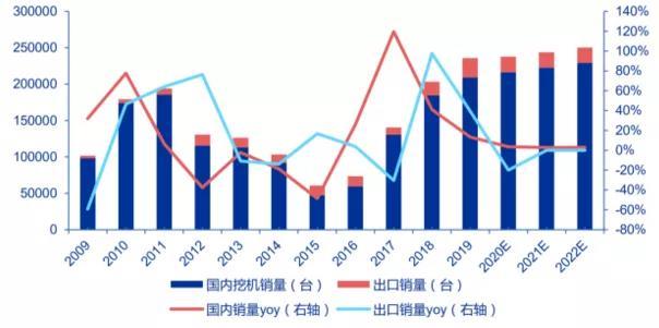 预计2020-2022年国内挖机销量中,更替需求分别为13.80万台、17.71万台、18.24万台,2021-2012年占比高达30%、50%。
