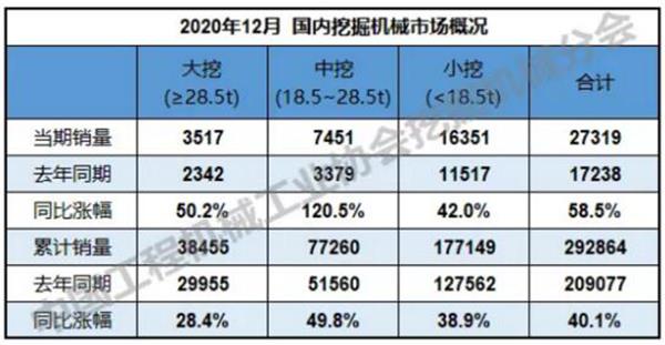 2020年12月,共计销售各类挖掘机械产品31,530台,同比涨幅56.4%。国内市场销量27,319台,同比涨幅58.5%。出口销量4,211台,同比涨幅44.4%。