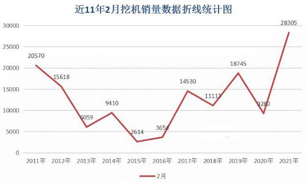 2021年2月挖掘机销量数据创2月历史新高,之前最高年份为2011年2月的20570台,2021年2月的28305台,超出2011年2月约38%。2021年1-2月累计4.79万台,比2011年1-2月累计3.17万台,超过约51%。