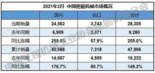 2021年2月,共计销售各类挖掘机械产品28305台,同比涨幅205.0%。